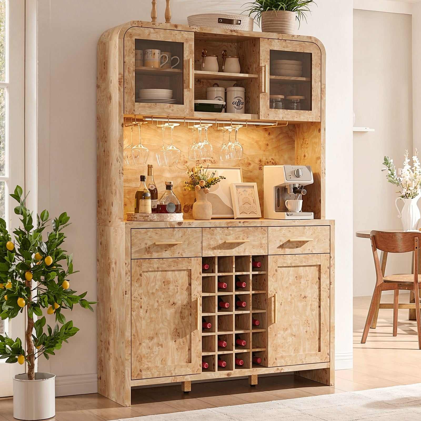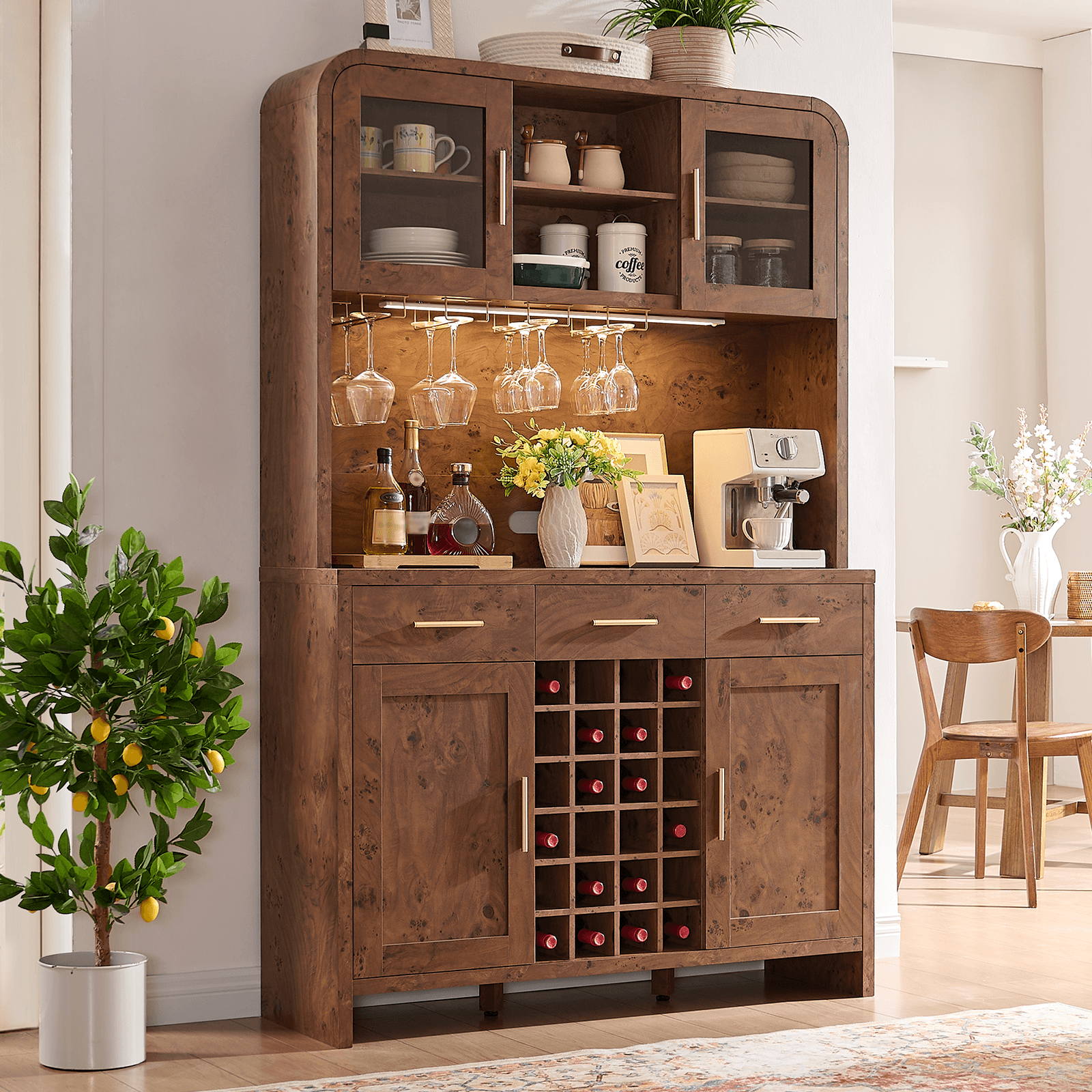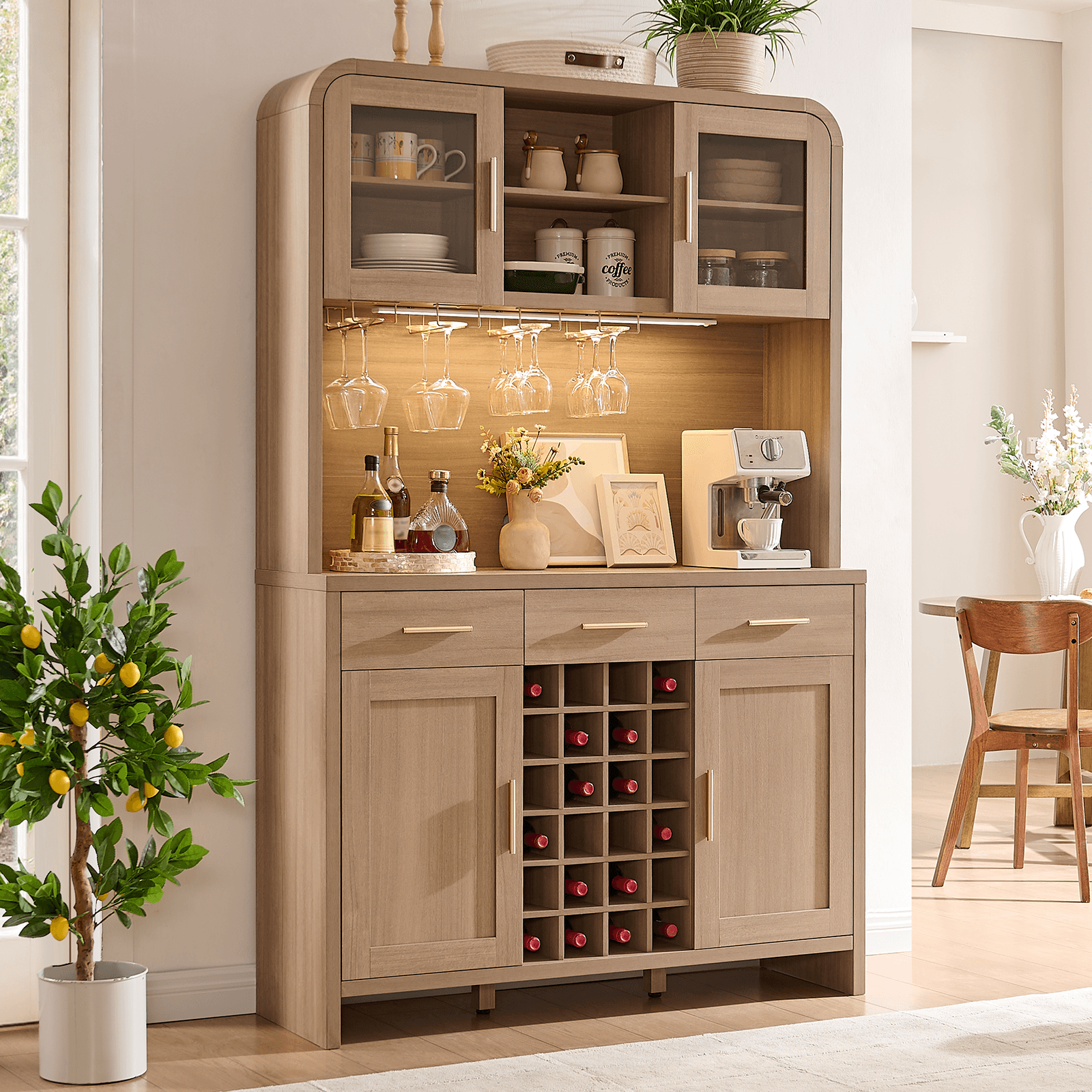 Maximize your kitchen space with our 77" Tall Oak Pantry Cabinet. Featuring a 24-bottle wine rack, LED lights, and a built-in charging station. The perfect all-in-one...