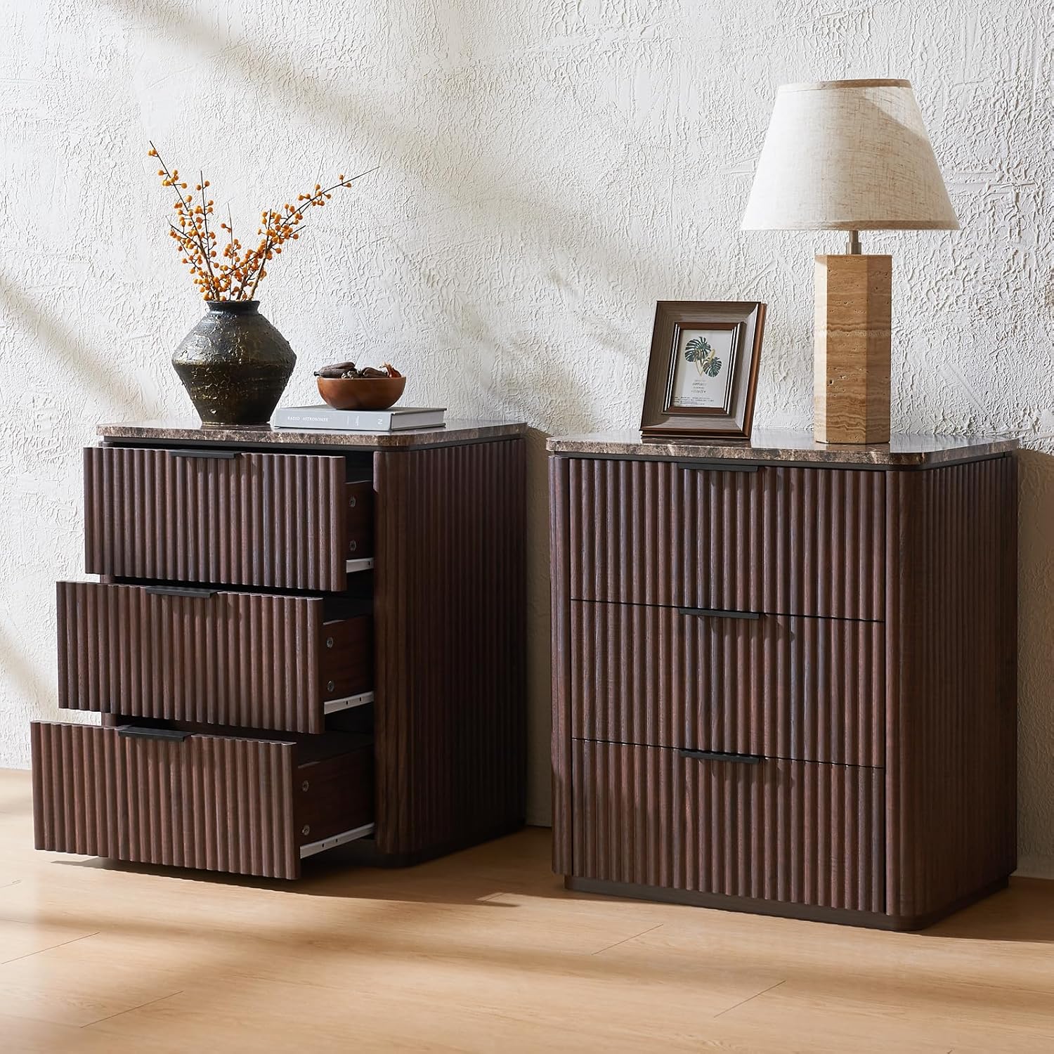 DelArk 3-Drawer Fluted Nightstand with Marble Top