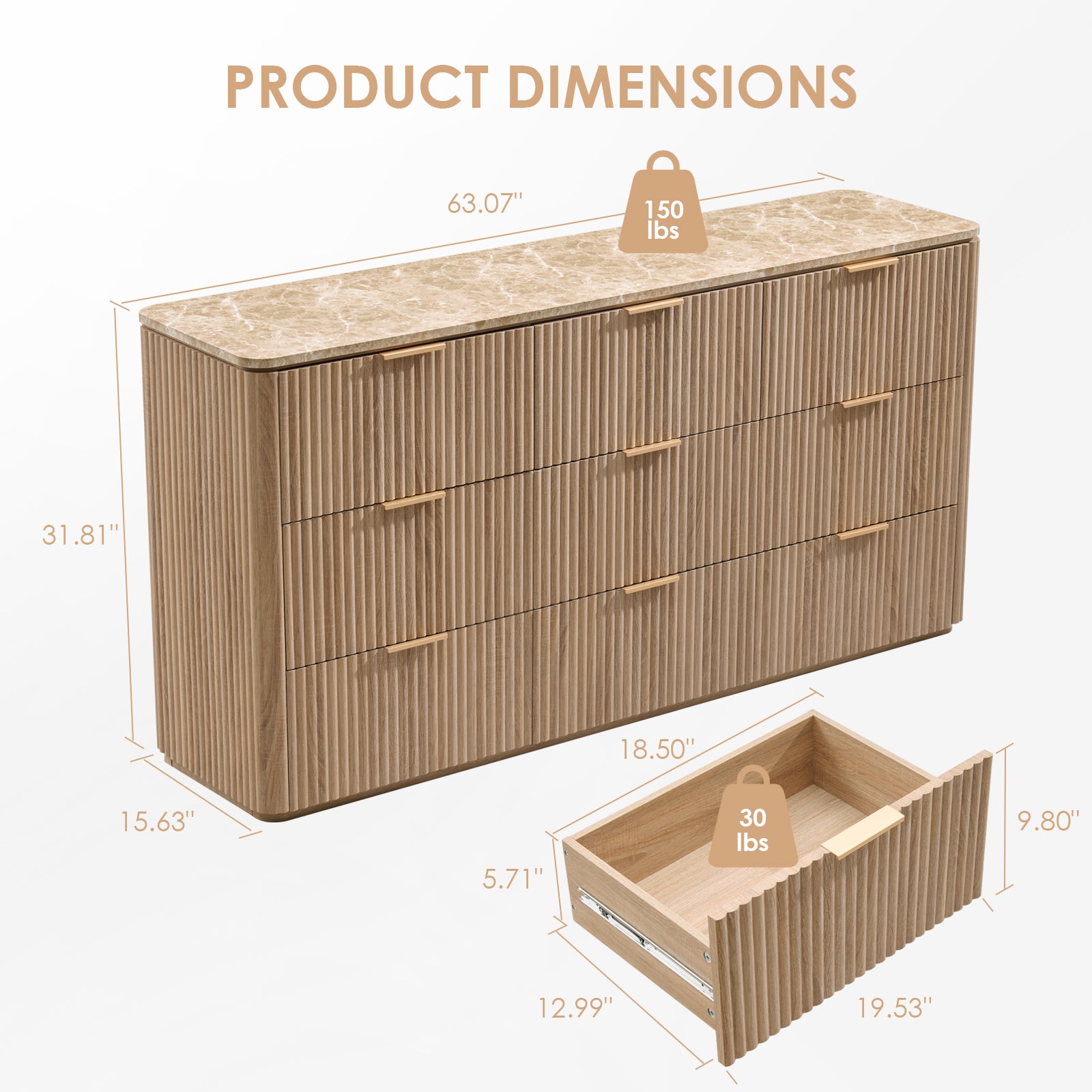 - Spacious 9-Drawer Dresser - Measuring 63"W x 15.6"D x 31.8"H, this large dresser provides 9 silent, smooth-glide drawers (19.52"W x 12.99"D x 5.7"/9.81"H) for organizing clothing, bedding, accessories, or jewelry. Each drawer holds up to 30 lbs, while the tabletop supports 150 lbs. Two dressers can be placed side by side for extra storage or used together as a TV stand and decorative display