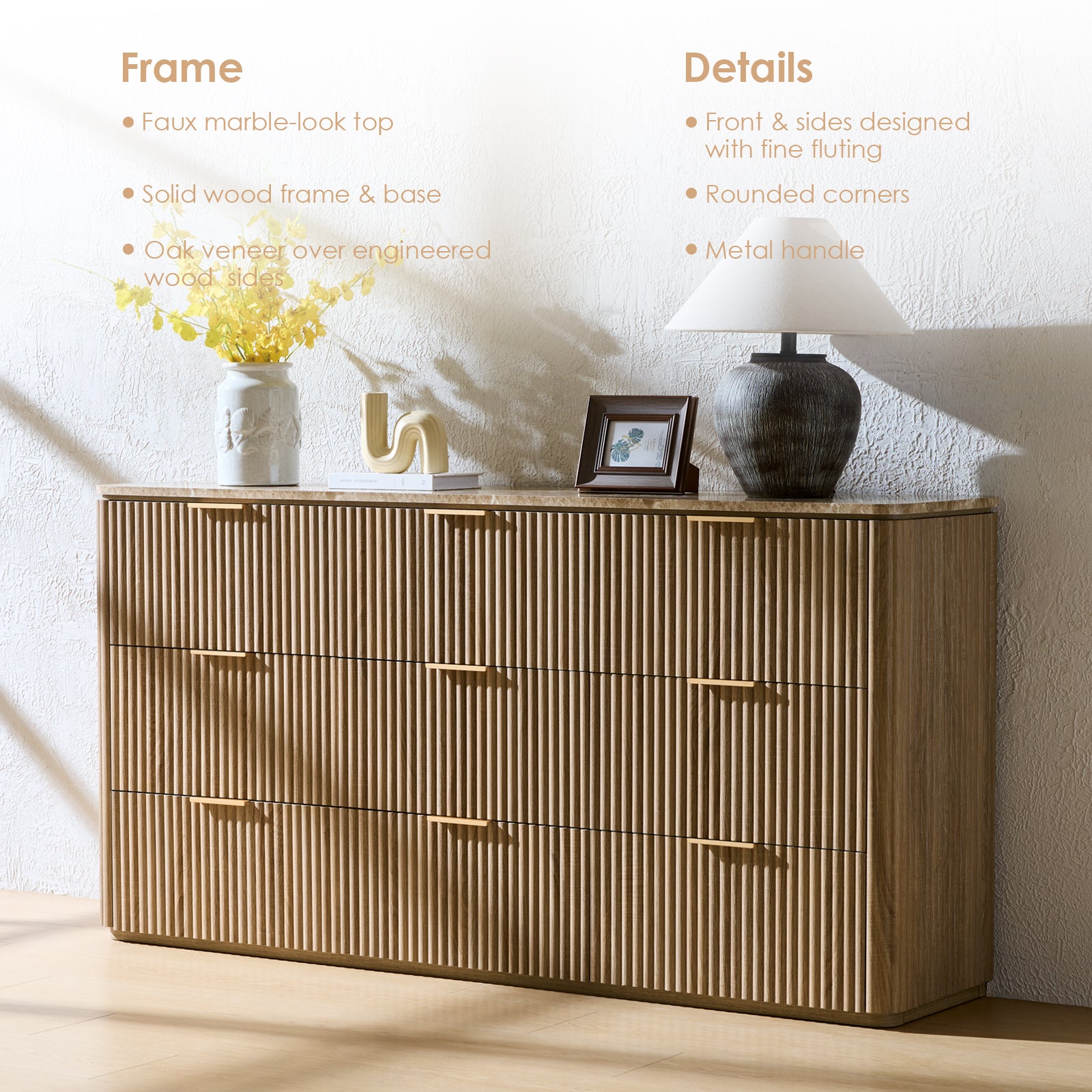 - Modern Luxury Design - Upgrade your bedroom or living space with this dresser featuring clean lines, a wave-pattern fluted front and sides, champagne gold or black handles, and a faux marble top. The smooth curved corners add elegance while keeping it safe for children, perfectly matching contemporary and transitional home decor